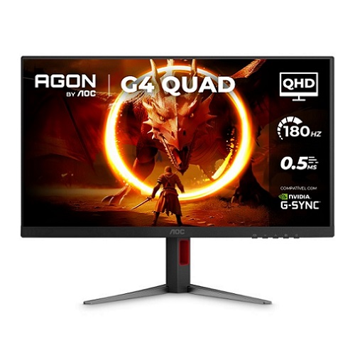 O Monitor Gamer AOC AGON Quad 27″ Q27G4F é um monitor gamer de 27 polegadas com resolução QHD (2560×1440), painel IPS, taxa de atualização de 180Hz e tempo de resposta de 0,5ms MPRT, ideal para jogos competitivos devido à sua fluidez e cores vibrantes, compatível com NVIDIA G-SYNC, oferecendo imagens nítidas, baixo borrão e conforto visual com tecnologia Flicker-Free e base ajustável.